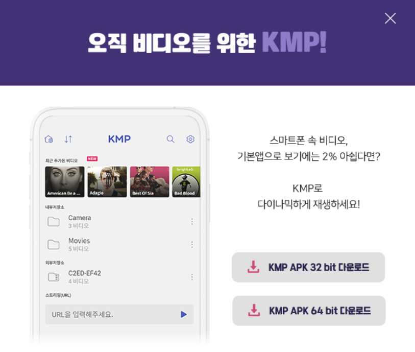 태블릿과 스마트폰 어디서든지 비디오를 재생할 수 있습니다. 언제 어디서나 당신의 비디오를 KMP로 재생하세요.