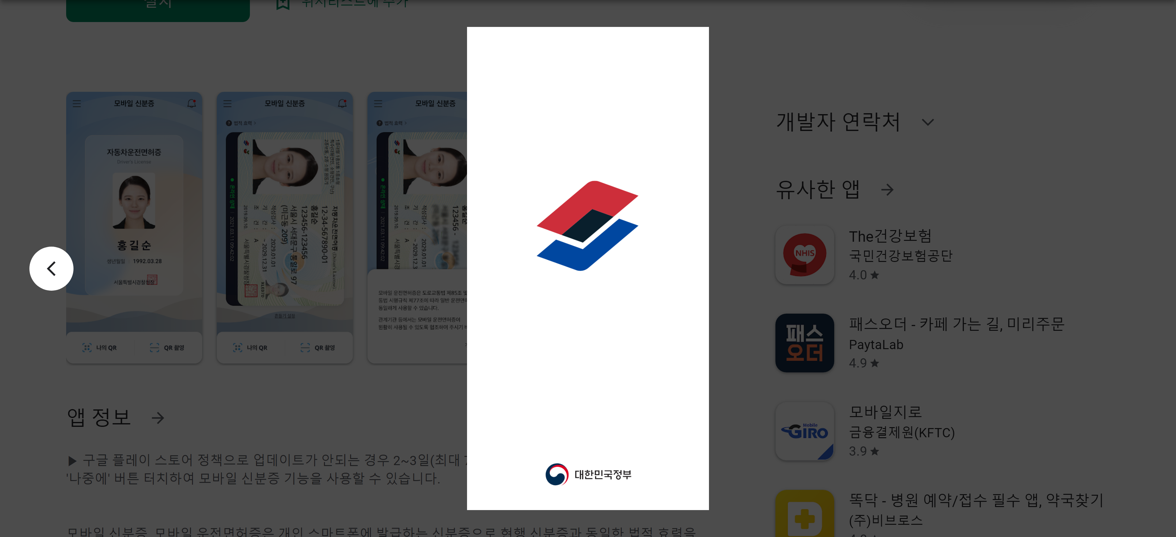 ▶ 구글 플레이 스토어 정책으로 업데이트가 안되는 경우 2~3일(최대 7일) 이후에 업데이트 부탁드리고, 팝업의 '나중에' 버튼 터치하여 모바일 신분증 기능을 사용할 수 있습니다.