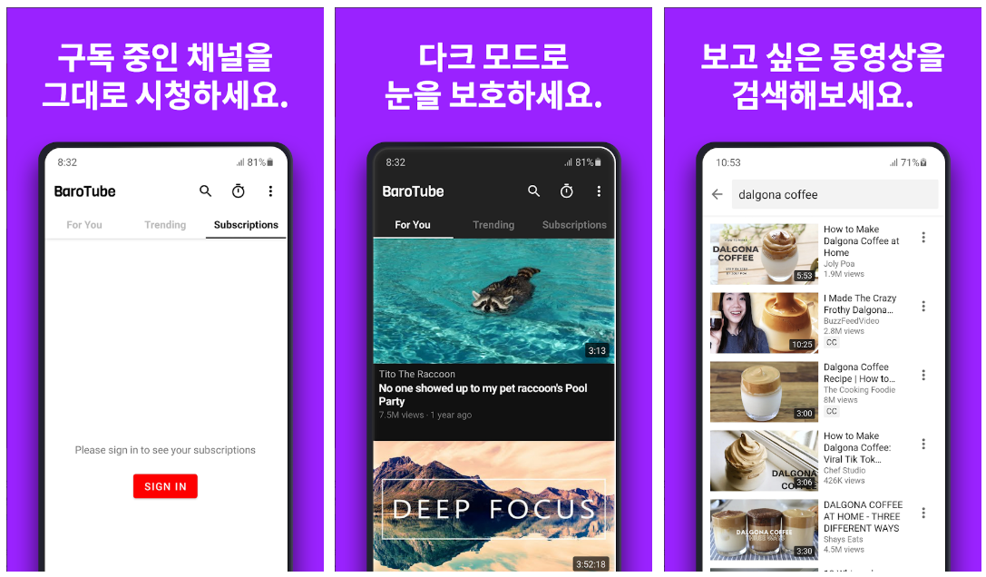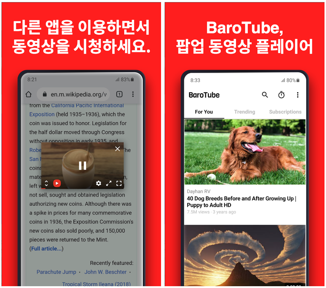 바로튜브를 이용해서 팝업 창으로 동영상을 감상하세요! 프리미엄 구독 없이 다른 앱을 실행하면서 동영상도 시청할 수 있습니다! 100% 무료입니다!