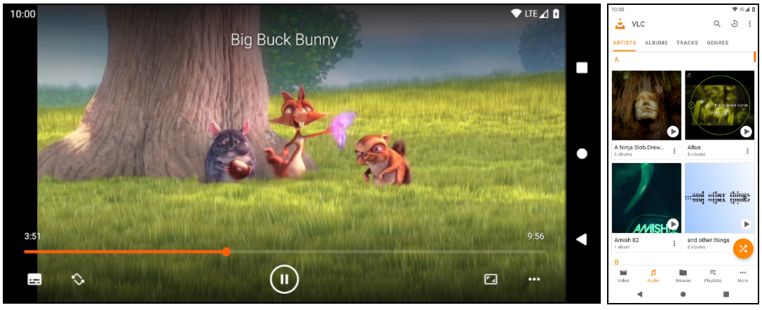 VLC는 다중 트랙 오디오 및 자막을 지원합니다. 자동 회전, 종횡비 조정 및 제스처를 지원하여 볼륨, 밝기 및 탐색을 제어합니다.