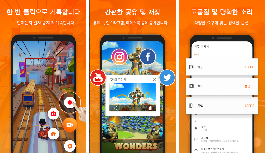 스마트폰의 화면녹화를 간단하게 어플로 화면 녹화가 가능합니다. 스마트폰을 이용하여 게임을 하다가 화면 녹화를 하고 싶다면 엑스레코더(XRecorder)를 실행하여 녹화 버튼만 누르면 간편하게 화면이 녹화되어 동영상으로 저장됩니다. 또 녹화된 영상을 페이스북이나 유튜브에 공유할 수 있는 기능이 있어 편리하게 사용할 수 있습니다.