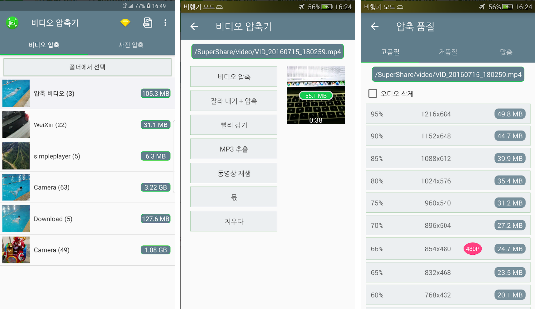 # 높음, 보통, 낮은 화질의 압축 된 동영상