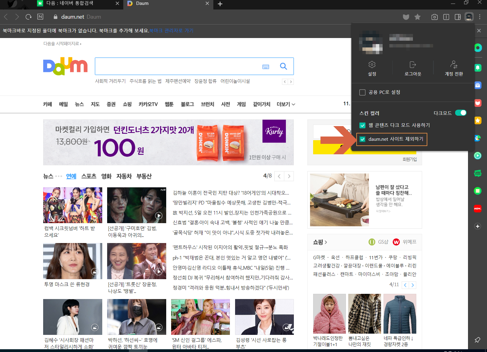 <웹 콘텐츠 다크모드 사용하기>를 활성화 시키면 <해당 사이트 제외하기> 메뉴가 생겨나고 이를 체크하면 특정 사이트는 다크모드에서 제외가 되어 배경이 밝게 변화가 생깁니다.