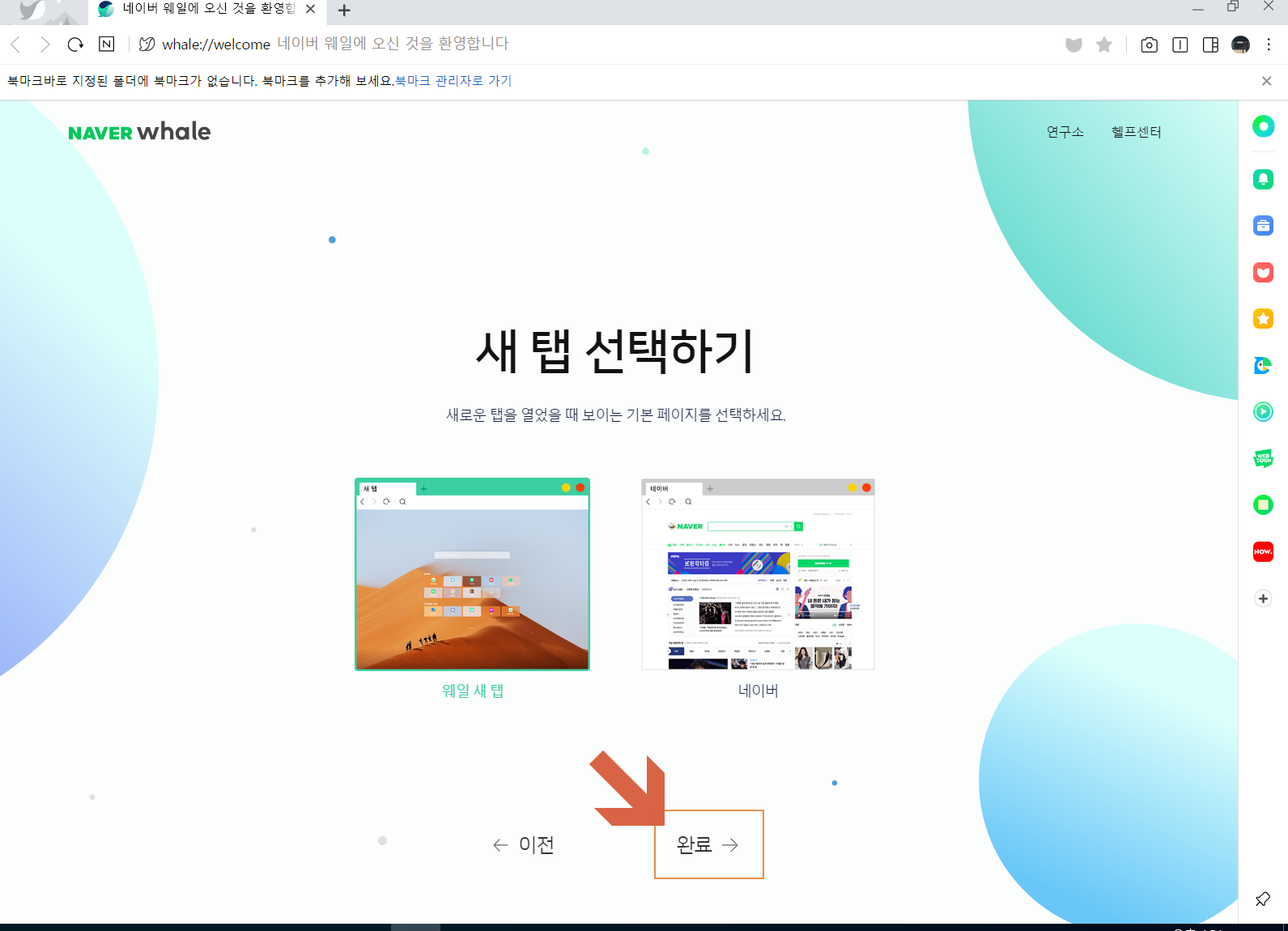 새 탭 선택하기 입니다. 새로운 탭을 열었을 때 보이는 기본 페이지를 선택하시면 되지만 이 또한 네이버 로그인으로 이전에 설정이 동기화되므로 <완료>를 누릅니다.