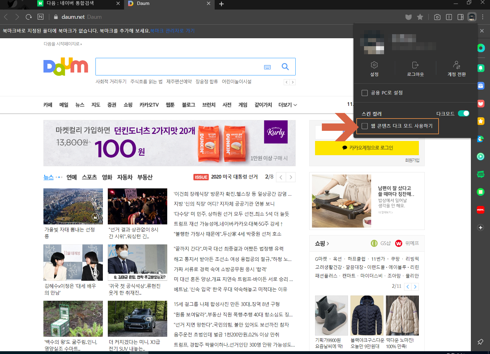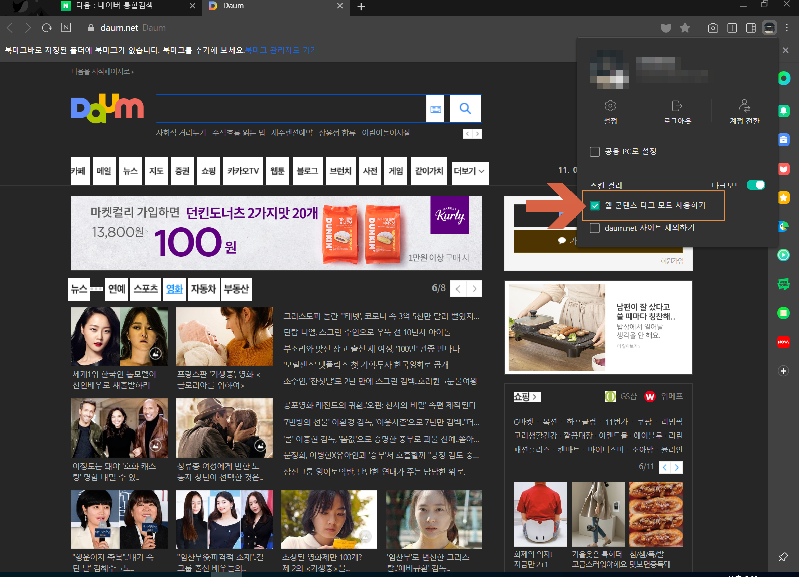 다크모드가 활성화되면 <웹 콘텐츠 다크모드 사용하기>라는 메뉴가 나타납니다. 주변이 어두울때 눈 부심을 방지하기 위해서 유용할 듯합니다.