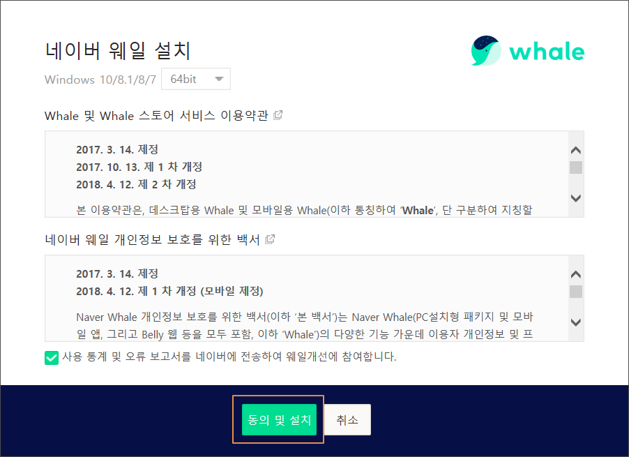 네이버 웨일 설치가 시작됩니다. <동의 및 설치>를 누릅니다.