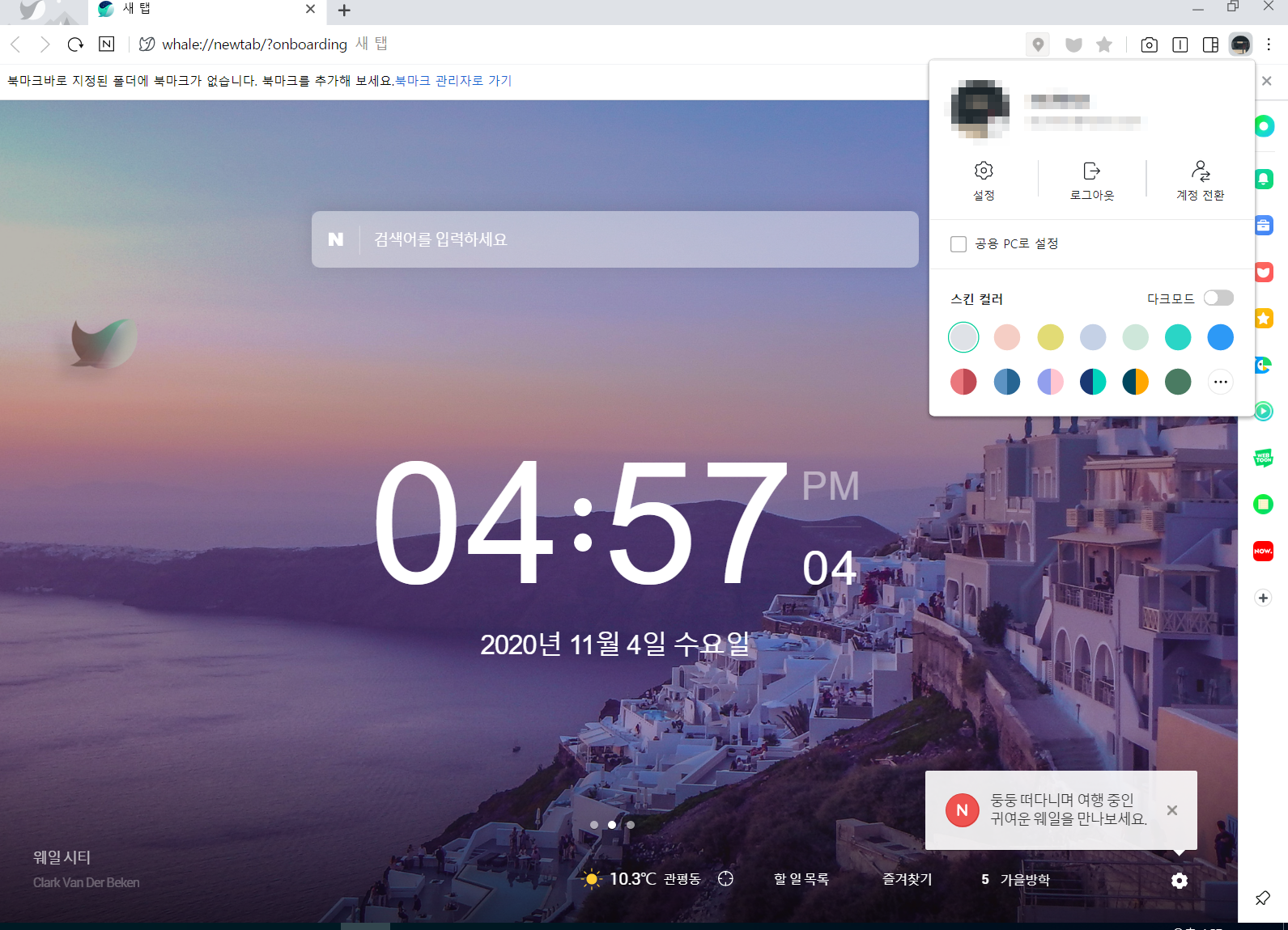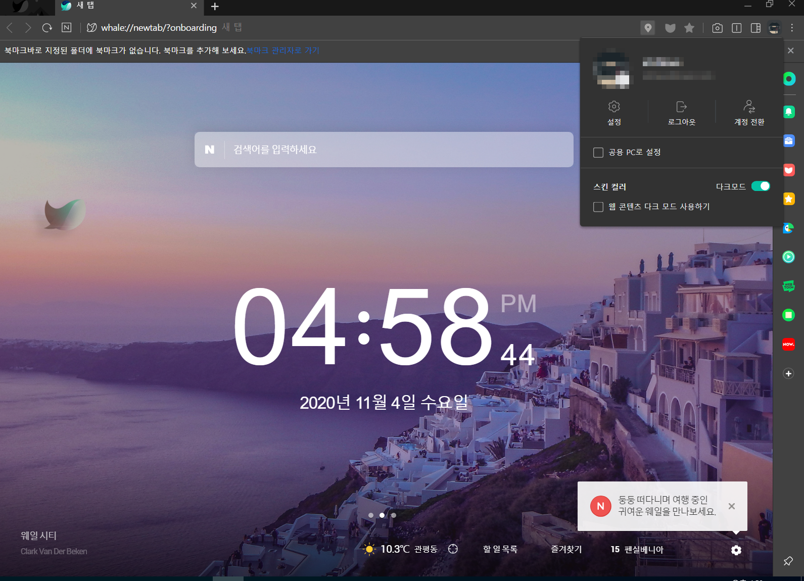 다크 모드를 활성화하면 웨일 브라우저가 어둡게 변화합니다. 야간 모드 테마라고 할 수 있을듯 합니다. 노트북을 사용한다면 배터리 사용시간이 늘어날듯 합니다.