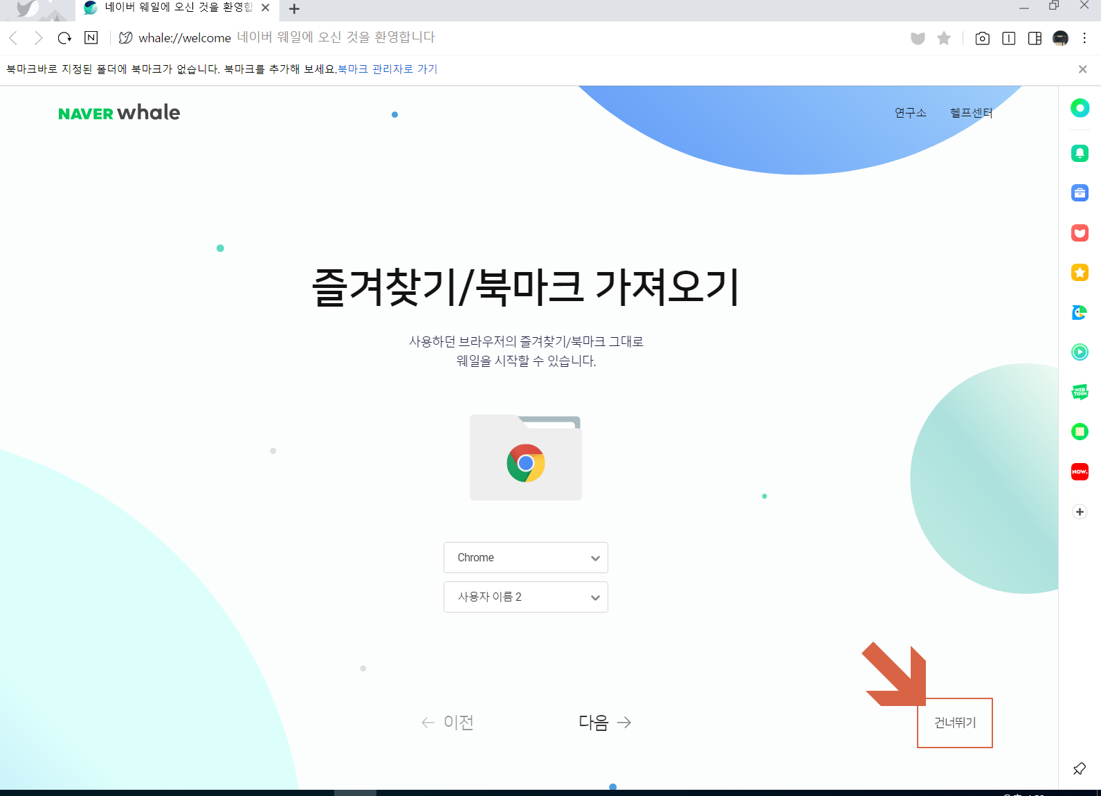 즐겨찾기/북마크 가져오기를 설정합니다. 기존 사용중인 다른 브라우저에서 가져올 수도 있으나 필요시 설정해도 되므로 <건너뛰기>를 누릅니다.