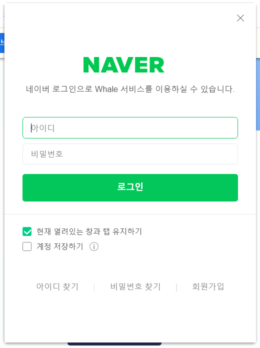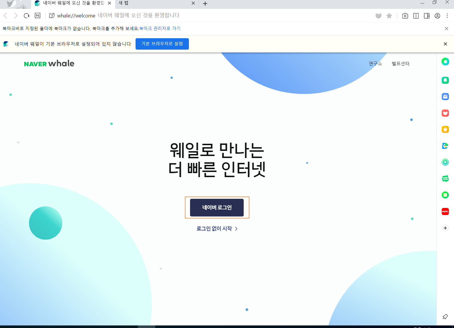 설치가 완료되면 빠르게 웨일 브라우저가 실행됩니다. <네이버 로그인>을 누릅니다.