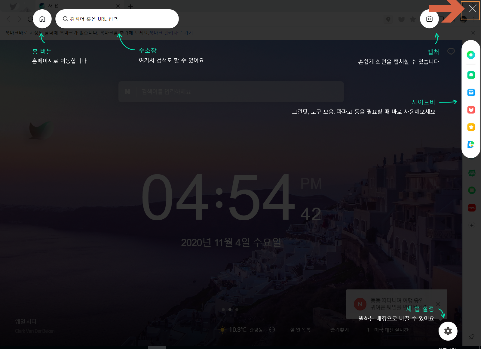 네이버 웨일 브라우저 화면이 나타났습니다. 이미 로그인을 하였기때문에 기존에 사용하던 설정과 북마크, 사이드바 등의 기능이 활성화가 되어있습니다.