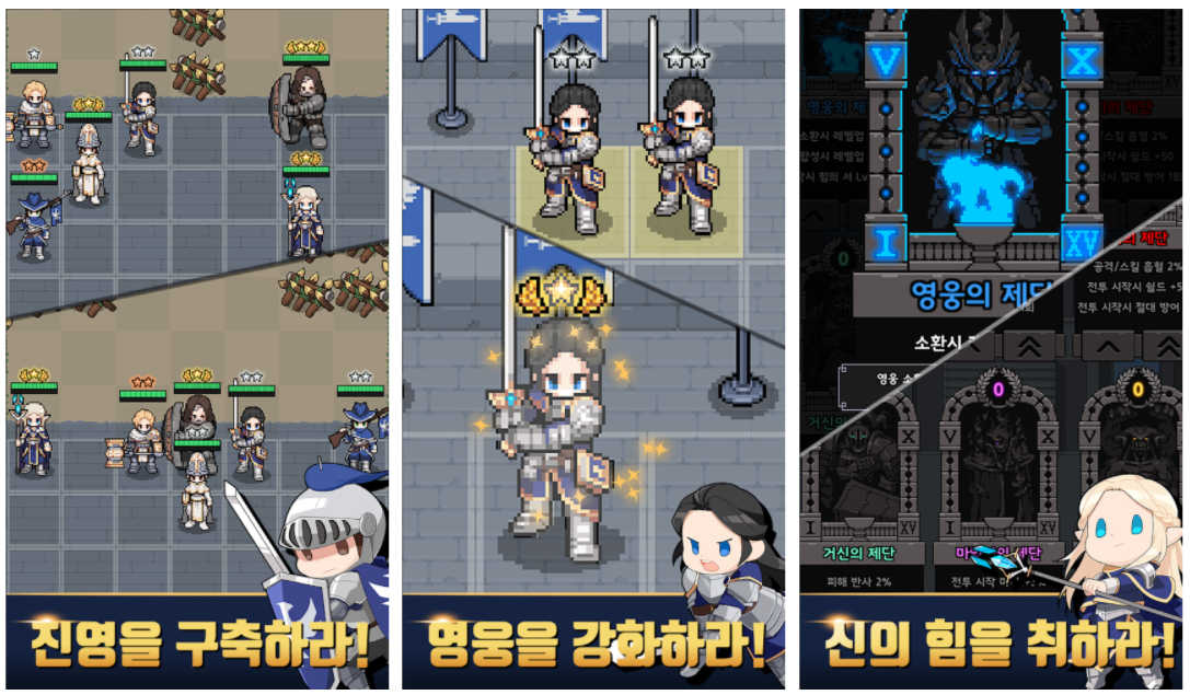 고전게임 감성의 도트 그래픽 속에서 내가 키운 영웅들이 적과 펼치는 전투를 지켜보는 재미가 있습니다. 영웅 레벨업과 영웅 간의 합체를 통해 더욱 강력한 팀을 만들어 새로운 스테이지에 도전하는 맛이 쏠쏠합니다.