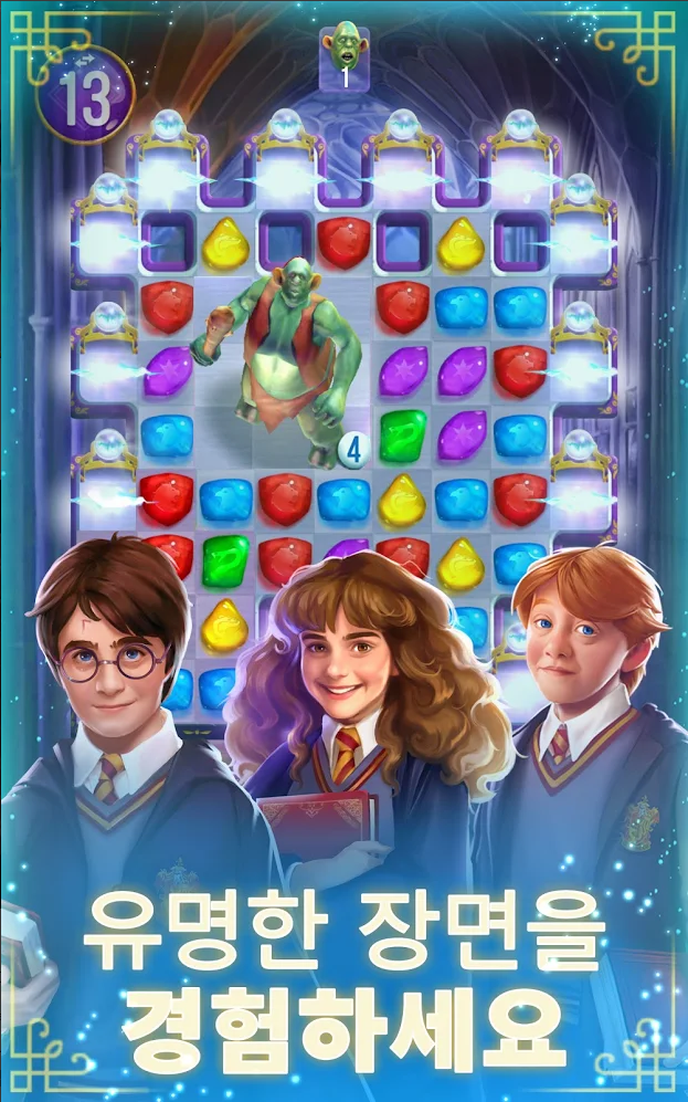 해리포터: 퍼즐과 마법은 신비로운 해리포터 속 마법 주문을 쓰며 3매치 퍼즐을 푸는 판타지 감성의 퍼즐 게임입니다. 다양한 마법 스킬을 적극적으로 활용해 액션 게임 못지않은 화려함과 짜릿함을 느껴보세요