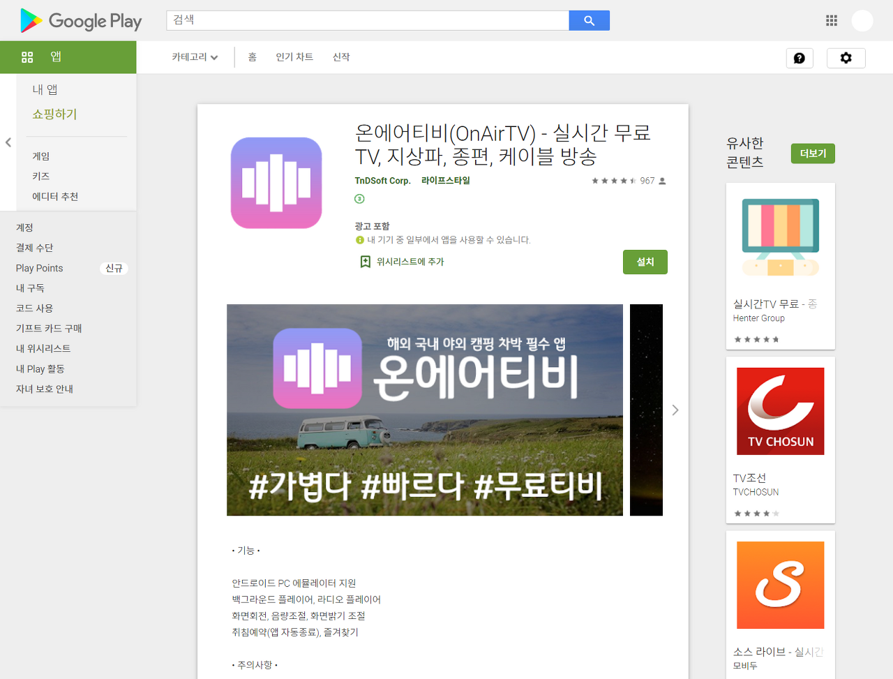 온에어티비(OnAirTV)는 안드로이드 PC 에뮬레이터를 지원하며, 백그라운드 플레이어, 라디오 플레이어
